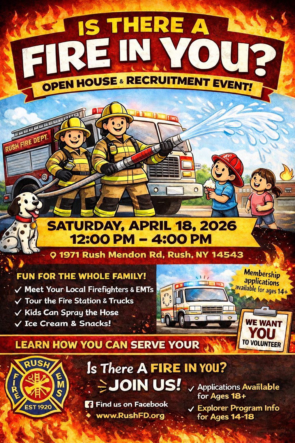 The Rush Fire Department will be hosting an open house on Saturday, April 18th from 12pm – 4pm. This will be held at our station one, located at 1971 Rush Mendon Rd, Rush NY 14543.